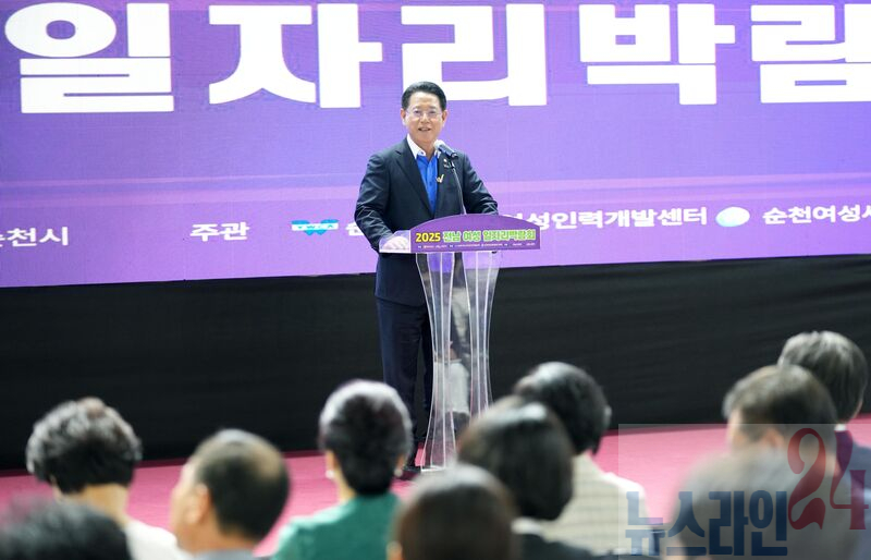 김영록 전라남도지사가 21일 순천 팔마실내체육관에서 열린 ‘2025년 전남 여성 일자리 박람회’에서 개회사를 하고 있다.