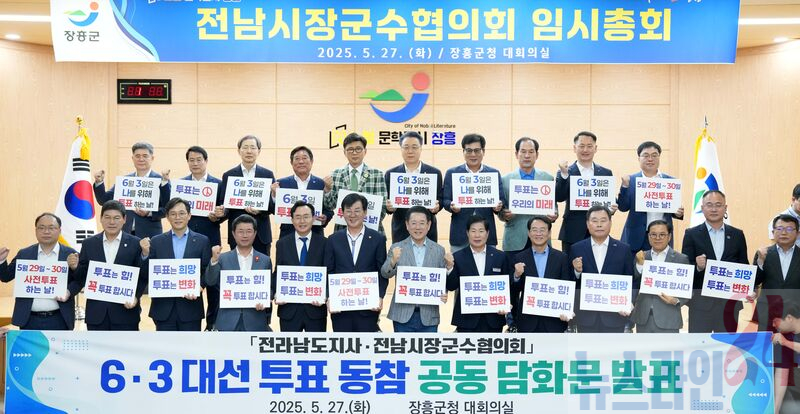 김영록 전라남도지사가 27일 장흥군청에서 열린 ‘전남시장·군수협의회 임시총회’에 참석, 시장·군수들과 투표참여 독려 퍼포먼스를 하고 있다.