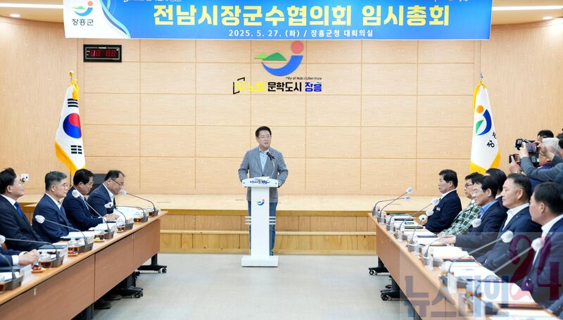 김영록 전라남도지사가 27일 장흥군청에서 열린 ‘전남시장·군수협의회 임시총회’에 참석, 인사말을 하고 있다.