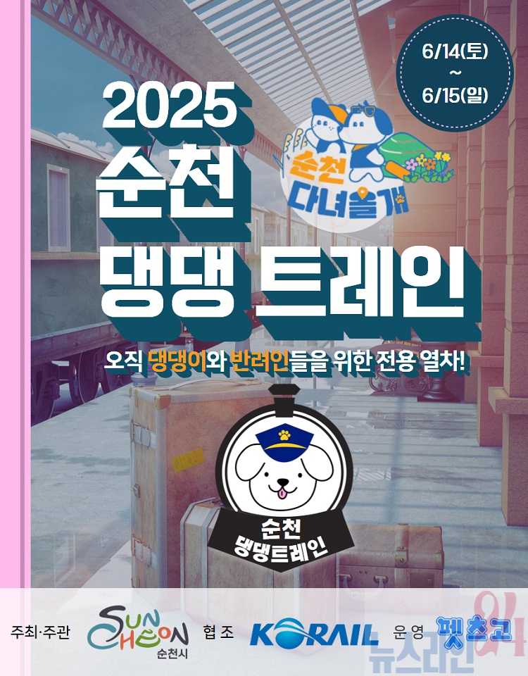순천시(시장 노관규)는 반려동물 친화관광도시 조성을 위해 전남 최초의 반려견 전용 열차 상품인 「2025 순천 댕댕트레인」을 기획·운영하며, 오는 6월 첫 운행을 앞두고 참가자를 모집 중이다고 밝혔다.