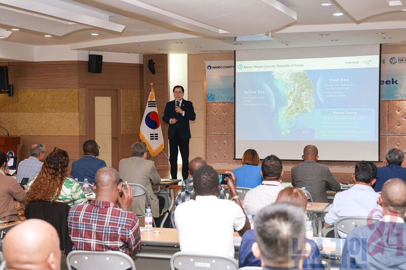 세계은행(WB) 관계자 및 해외 공무원들은 신우철 완도군수로부터 완도군 수산업 현황, 양식 기술 등 해조류산업 전반에 대해 설명을 듣고 질의응답의 시간을 가졌다.