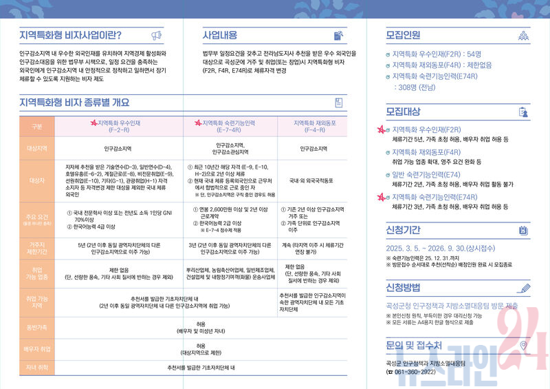 지역특화 우수인재(F2R) 신청기간은 2026년 9월까지로 상시 접수 가능하며, 지역특화 숙련기능인력(E74R)은 2025년 12월까지 선착순 모집 중이다. 신청모집 및 기타 자세한 사항은 인구정책과 지방소멸대응팀(☎061-360-2922)으로 문의할 수 있다.
