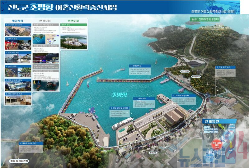특히 초평항을 진도군의 대표 관광미항으로 조성해 이를 마중물로 대명관광단지(쏠비치 진도)와 소규모 민간투자 사업의 활성화를 통한 경제 거점 구축을 주요 목표로 한다.