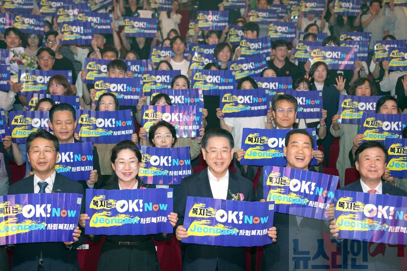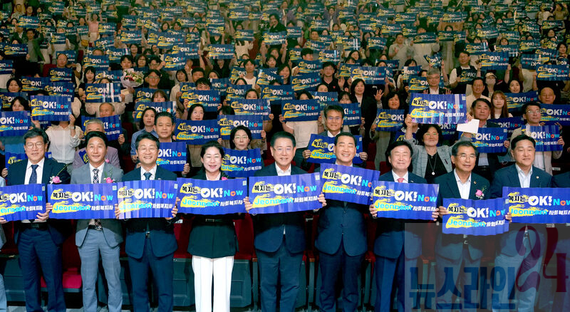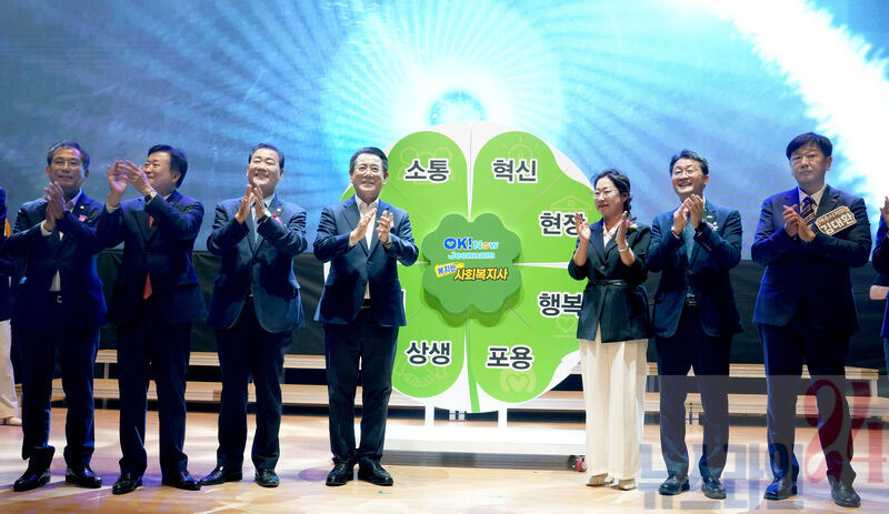 김영록 전라남도지사가 5일 여수엑스포컨벤션센터에서 열린 ‘제11회 전남사회복지사대회’에서 내빈들과 복지향상을 위한 퍼포먼스를 하고 있다.