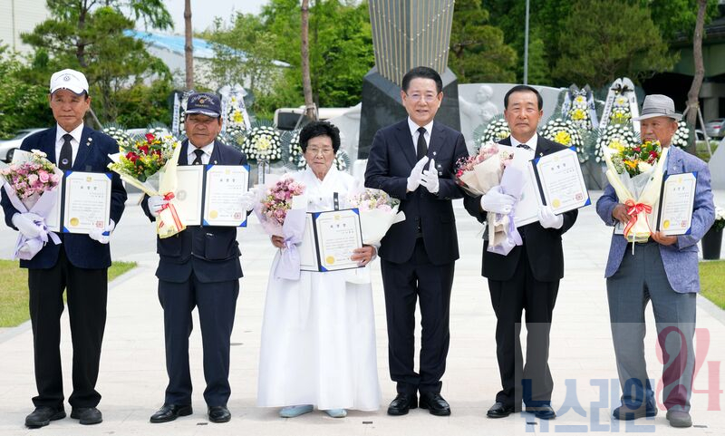 김영록 전라남도지사가 6일 담양군 평화예술광장에서 열린 ‘제70회 현충일 추념식’에 참석, 호국보훈 유공자들에게 표창장을 수여한 뒤 기념촬영을 하고 있다.