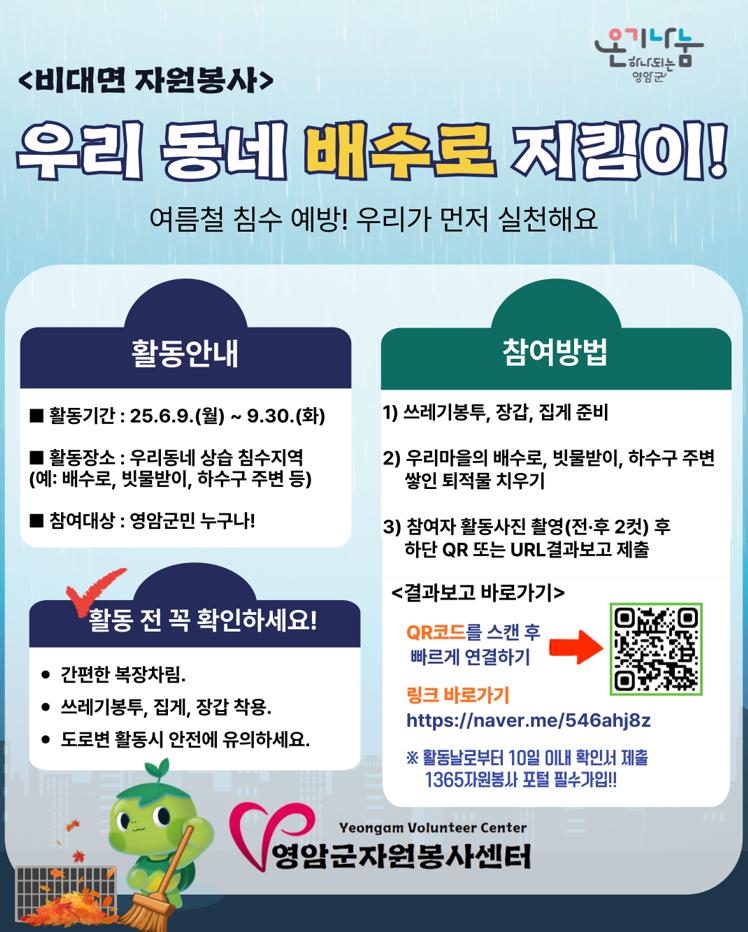 영암군 배수로 지킴이에는 영암군민 누구나 참여할 수 있는데, 마을의 배수로·빗물받이 등을 치우는 활동을 하고, 사진과 결과를 온라인(https://naver.me/546ahj8z)에 올리면 된다.