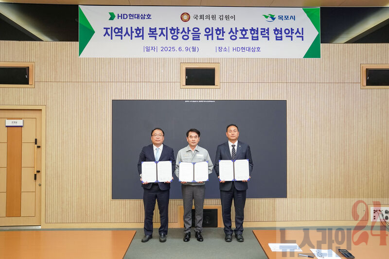 목포시는 HD현대삼호, 김원이 국회의원과 함께 지역사회 복지향상과 주민 삶의 질 개선을 위한 ‘지역사회 복지향상을 위한 상호협력 업무협약’을 체결했다.