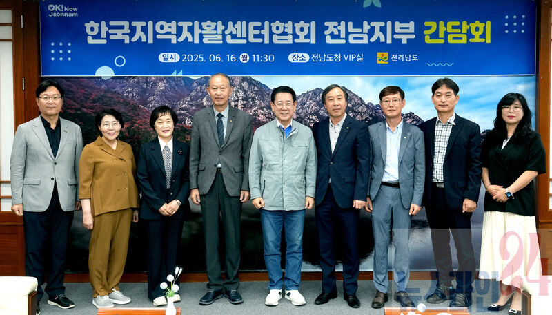 김영록 전라남도지사가 16일 도청 접견실에서 한국지역자활센터협회 전남지부 임원진들과 간담회를 갖고 기념촬영을 하고 있다.