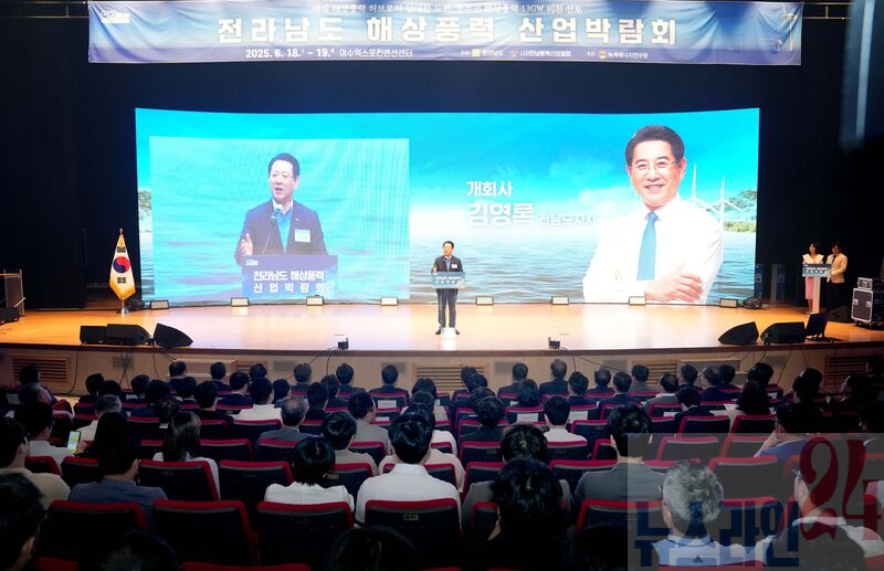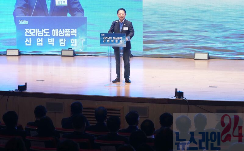 김영록 전라남도지사가 18일 여수엑스포컨벤션센터에서 열린 ‘전라남도 해상풍력 산업박람회’에 참석해 개회사를 하고 있다.