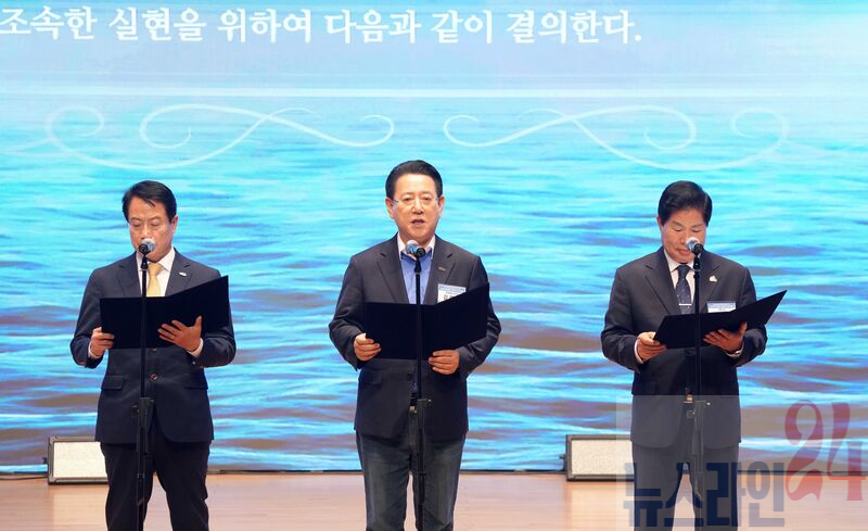 김영록 전라남도지사가 18일 여수엑스포컨벤션센터에서 열린 ‘전라남도 해상풍력 산업박람회’에 참석해 정기명 여수시장, 공영민 고흥군수와 해상풍력 보급 확대를 위한 동부권 13GW 비전선포 도-시·군 공동결의문을 발표하고 있다.