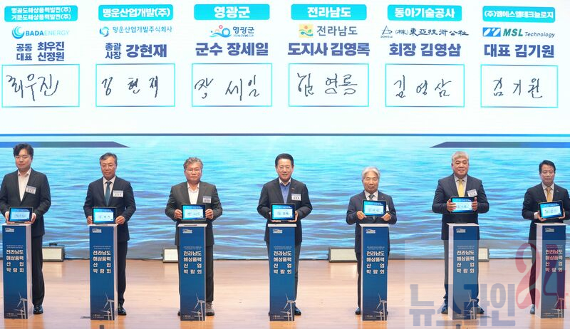 김영록 전라남도지사가 18일 여수엑스포컨벤션센터에서 열린 ‘전라남도 해상풍력 산업박람회’에 참석해 시·군, 발전사들과 에너지 기본소득 조성 및 해상풍력 기자재 공급망 구축을 위한 업무협약을 체결하고 있다.