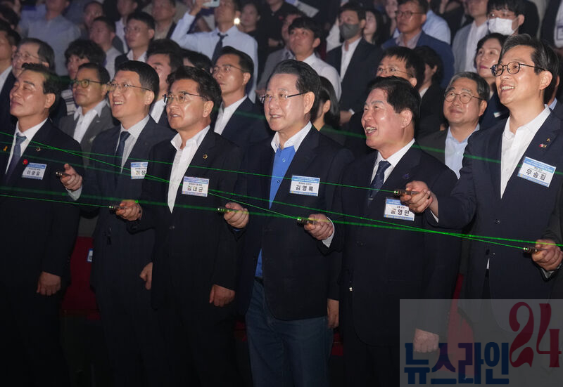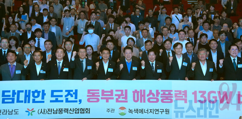 김영록 전라남도지사가 18일 여수엑스포컨벤션센터에서 열린 ‘전라남도 해상풍력 산업박람회’에 참석해 주요내빈들과 전라남도 해상풍력 30GW 보급 확대 방안 비전 선포 퍼포먼스를 하고 있다.