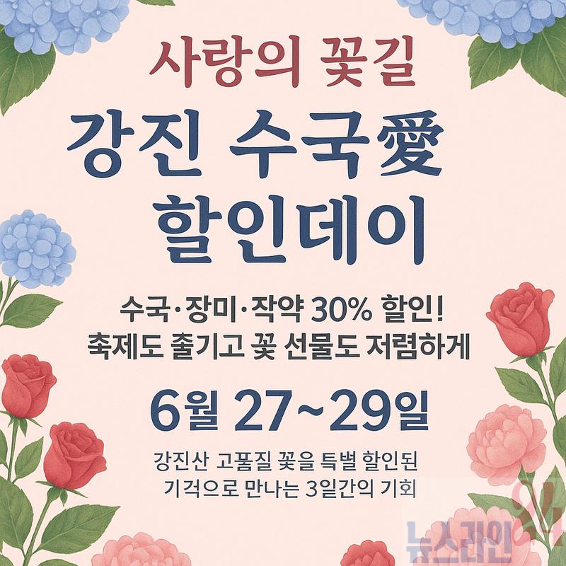 제3회 강진 수국길축제가 오는 27일부터 29일까지 강진군 강진읍 보은산 V랜드 공원에서 개최된다. 축제장에는 형형색색의 수국들을 통해 다양한 포토존과 체험 프로그램이 구성돼 있으며, 수국 축제의 테마와 분위기에 맞는 아름다운 경관이 조성될 예정이다.