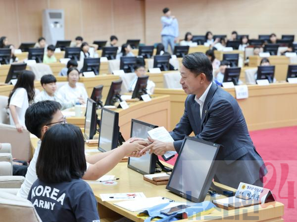 이날 의회교실에서 이재태 의원은 참여 학생들에게 따뜻한 환영의 인사를 건넨 뒤 도의회의 역할과 민주주의의 가치 그리고 정치 참여의 중요성에 대해 학생들의 눈높이에 맞춰 설명했다.