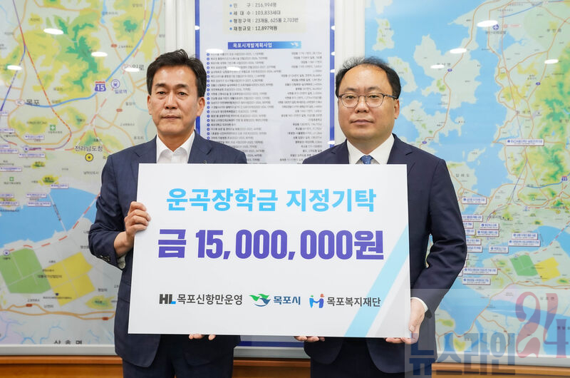 목포신항만운영(주)이 지난 24일 저소득 대학생을 위한 운곡(雲谷)장학금 1,500만 원을 목포복지재단에 지정 기탁 했다.