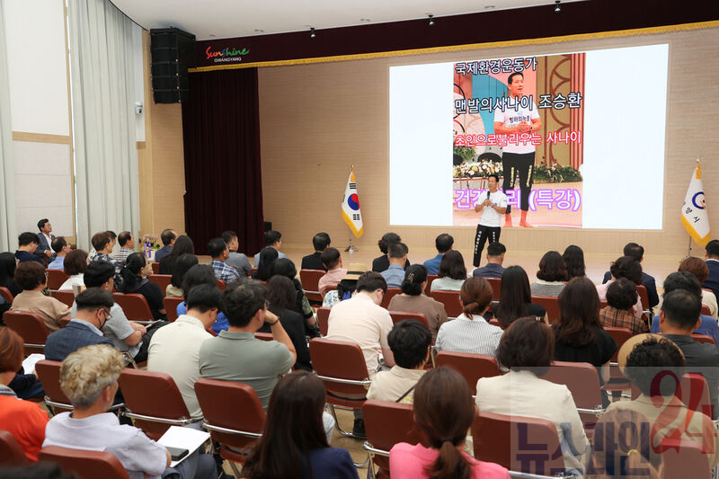 1부 강의는 시 홍보대사로 활동 중인 국제환경운동가 ‘맨발의 사나이’ 조승환 씨가 맡았다. 지난 6월 15일 ‘넷제로워크챌린지 부산 2025’에 초청돼 ‘얼음 위 맨발 서 있기’ 세계 신기록(5시간 15분)을 경신한 조 홍보대사는 이날 ‘정신력 플러스 건강관리’를 주제로, 운동과 식습관을 통한 일상 속 건강관리 노하우와 실천 방법을 소개했다. 강의 후에는 질의응답을 통해 시민들과 구체적인 적용 사례를 공유했다.