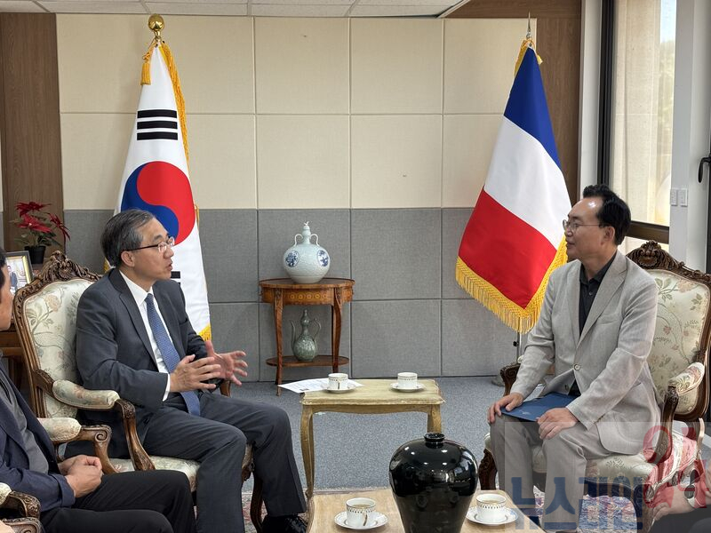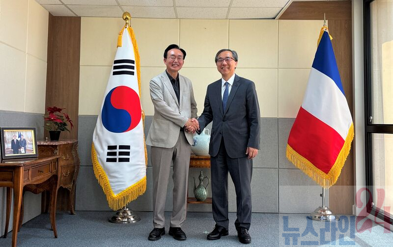 윤병태 나주시장(왼쪽)은 문승현 주프랑스 대한민국대사(오른쪽)와 만나 프랑스 도시들과의 지속적인 교류 확대 방안과 한불수교 140주년을 기념한 연계 행사에 대한 외교적 협력을 요청했다전라남도 나주시가 한불수교 140주년을 앞두고 주프랑스 대한민국대사관과 한국문화원을 잇달아 방문해 프랑스와의 실질적 외교, 문화 교류 확대에 나섰다.