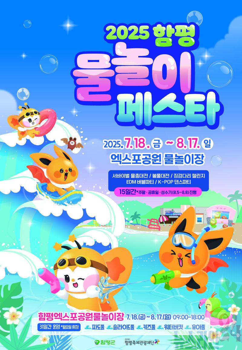한편, 함평엑스포공원 물놀이장은 오는 7월 18일 금요일부터 8월 17일 일요일까지 운영하며, 월요일은 환경 정비를 위해 휴장한다.
