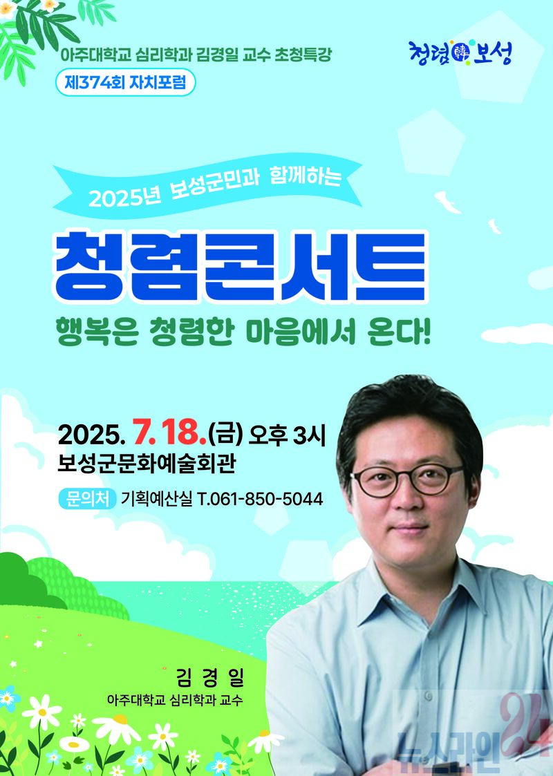 보성군은 오는 7월 18일 오후 3시부터 5시까지 보성군문화예술회관에서 아주대학교 심리학과 김경일 교수를 초청해 ‘청렴콘서트’를 개최한다고 밝혔다.