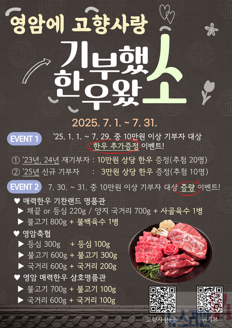 첫째, 2023년이나 2024년에 기부하고, 올해 7/29일까지 거듭 기부한 재기부자에게는 변함없는 영암 사랑에 보답하는 의미로, 추첨을 거쳐 20명을 선발 10만원 상당의 영암한우를 추가 증정한다.