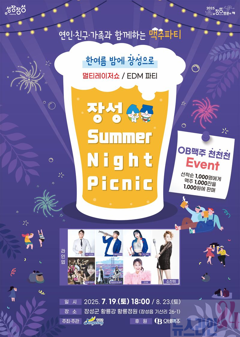 한편, ‘장성의 중심’ 황룡강도 더위에 지친 사람들을 위한 선물을 준비했다. 이달 19일 오후 6시 황룡정원 야외무대에서 ‘장성 썸머나잇 피크닉’이 열린다. 폭발적인 가창력을 지닌 가수 소찬휘를 필두로 더위에 지친 사람들에게 활력소가 될 음악을 들려준다. 선착순 1000명에게 맥주 1000잔을 1000원에 판매하는 행사도 연다.