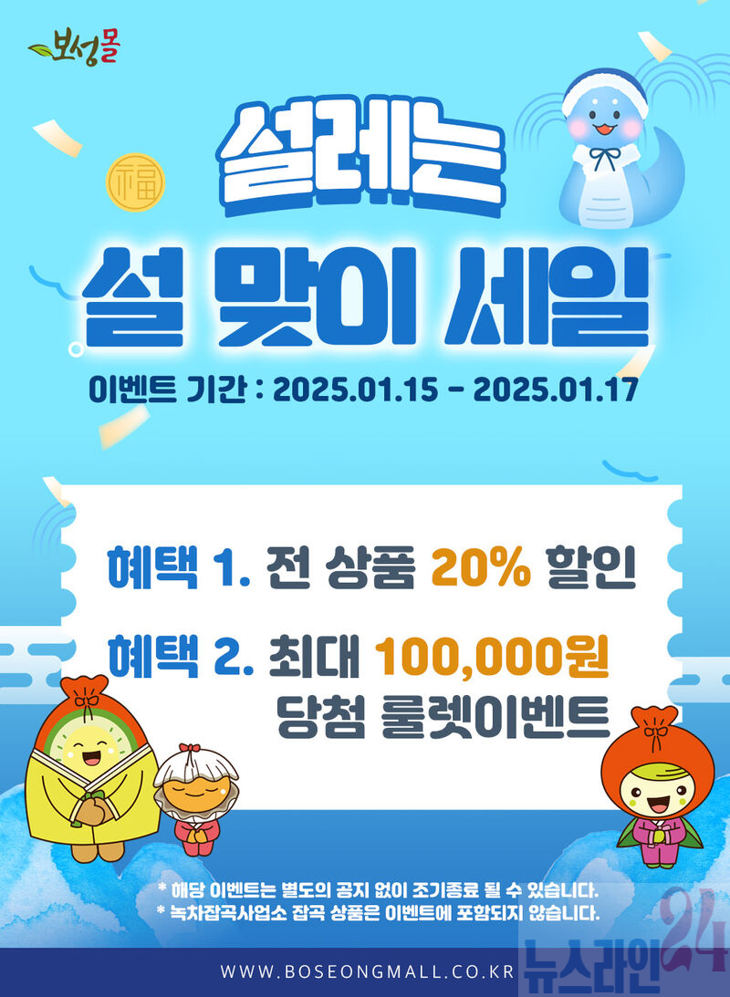이번 할인행사는‘보성몰’을 이용하는 모든 고객을 대상으로 20% 할인(일부 품목 제외), 룰렛 이벤트(2천~10만 포인트 적립) 등 설레는 설 명절을 맞이해 특별한 혜택이 제공된다.