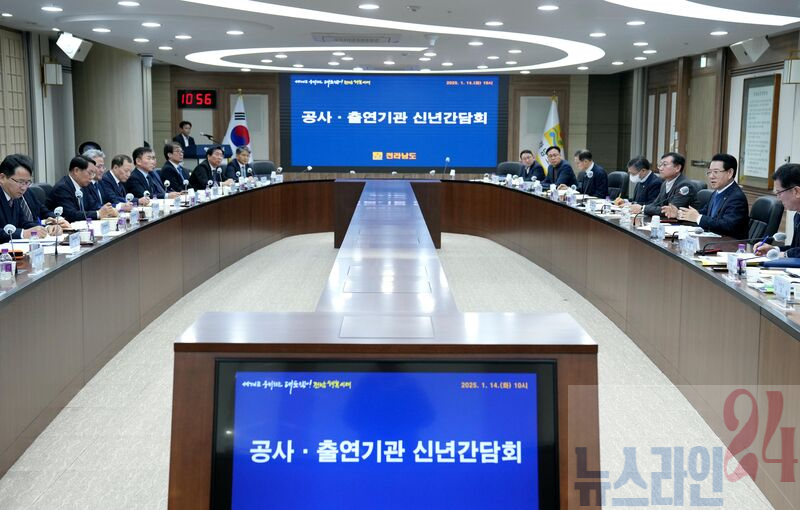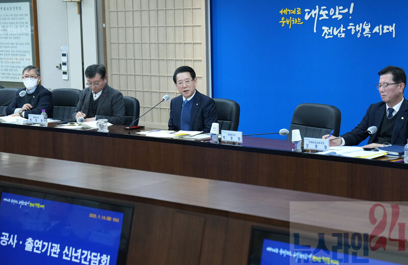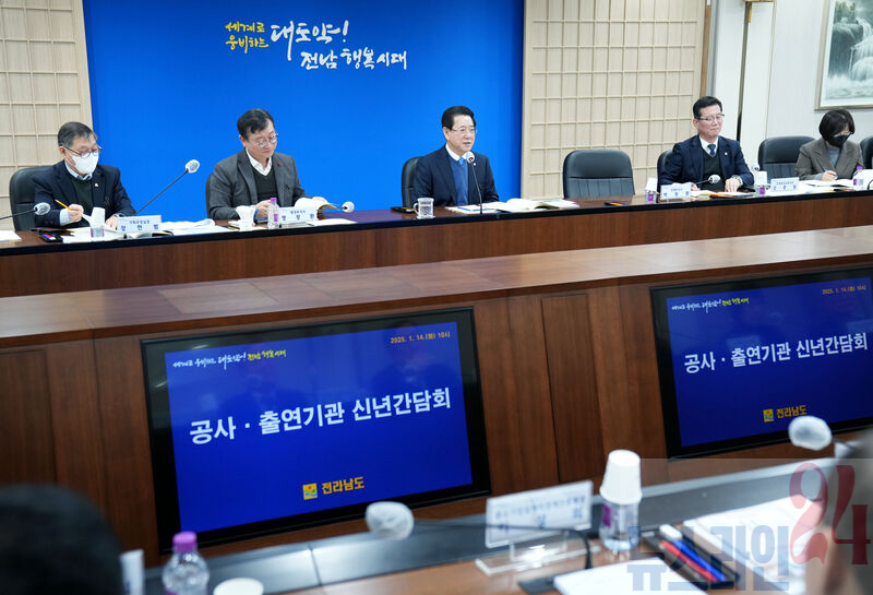 김영록 전라남도지사가 14일 도청 서재필실에서 전남개발공사, 전남연구원 등 도 산하 19개 공공기관장이 참석한 가운데 열린 ‘2025년 공사․출연기관 신년 간담회’를 주재하고 있다.