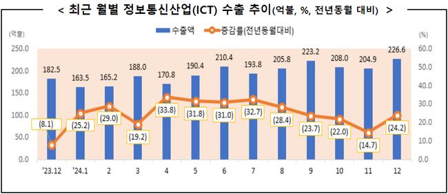 이는 역대 최대치였던 2022년의 2,332억 달러를 뛰어넘는 수치다. 12월 ICT 수출액은 226.6억 달러로, 올해 최대 월 수출액을 달성하며 14개월 연속 증가세를 이어갔다.