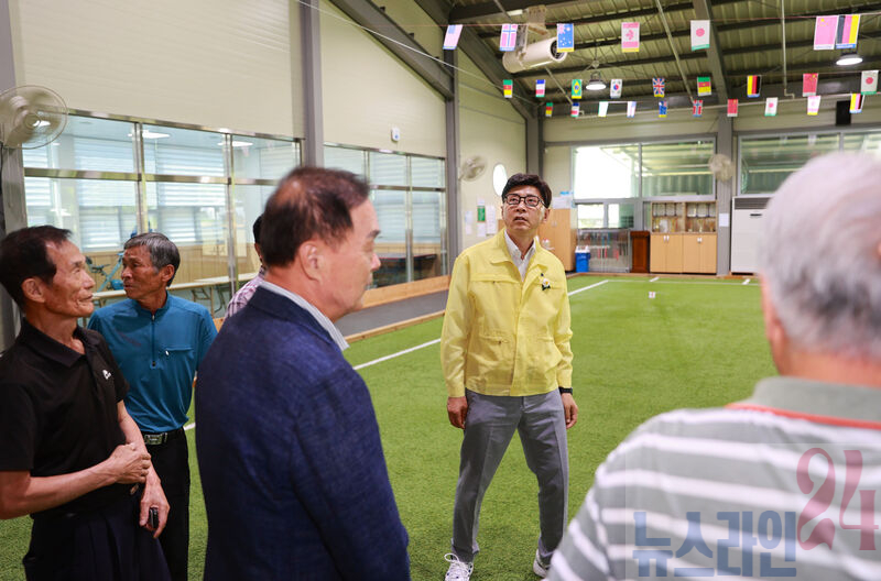 14일, 김철우 보성군수가 지속적인 폭염에 대응하고자 문덕면 실내게이트볼장을 찾아 시설물 점검 및 관리 상태를 세심히 살피고 있다.