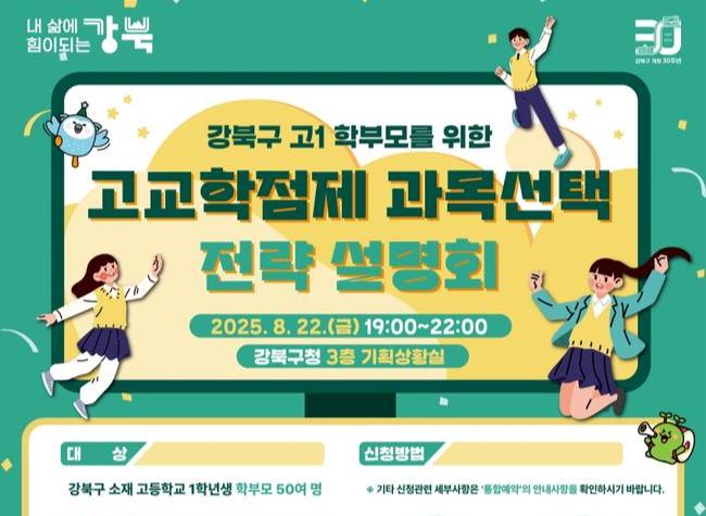 서울 강북구(구청장 이순희)는 오는 8월 22일(금) 오후 7시 강북구청 기획상황실에서 관내 고등학교 1학년 학부모를 대상으로 `고교학점제 과목선택 전략 설명회`를 개최한다.