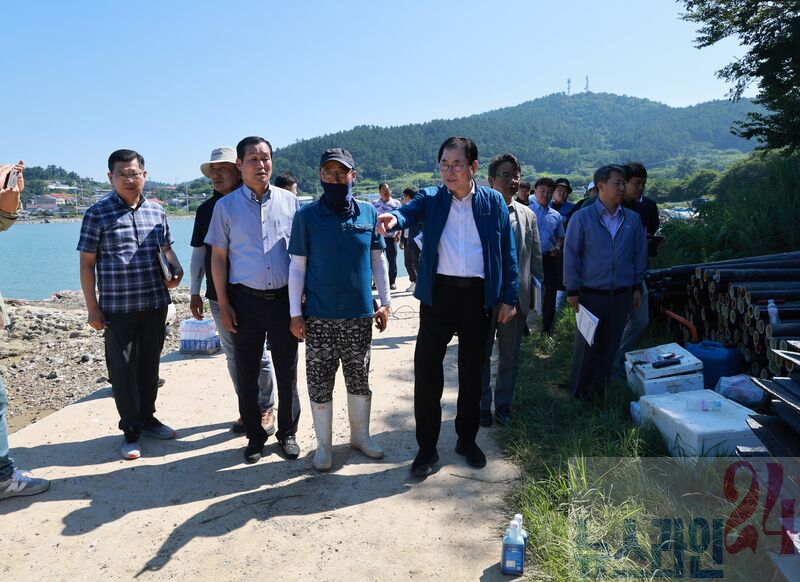 신우철 완도군수는 지난 24일 전복 가두리 감축 사업이 한창인 노화읍 당산리를 찾아 폭염 속에서도 작업에 나선 (사)한국수산업경영인 완도군연합회 회원들과 어업인들을 격려하고 애로 사항을 청취했다.