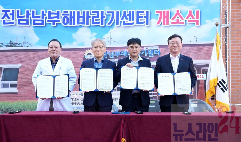명창환 전라남도 행정부지사가 29일 강진의료원에서 열린 ‘전남남부해바라기센터 개소식’에 참석, 여성가족부, 전남경찰청, 강진의료원과 ‘전남남부해바라기센터 운영을 위한 업무협약’을 체결하고 있다.