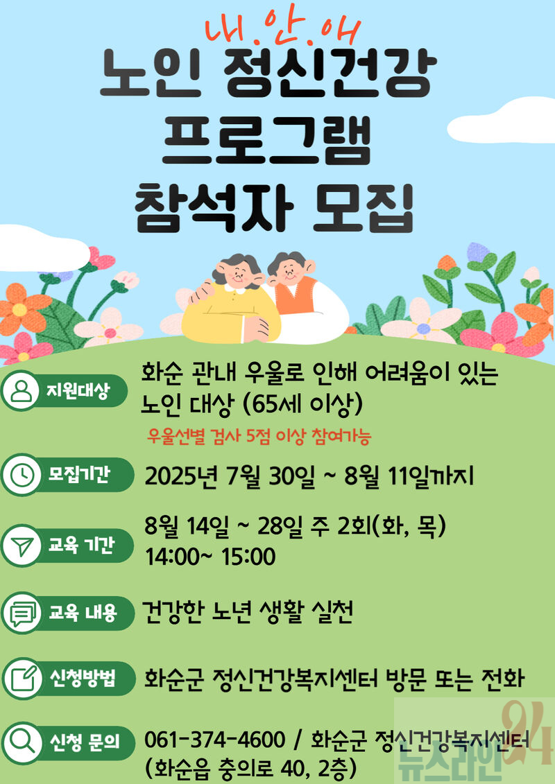화순군(군수 구복규)은 보은병원에 위탁 운영 중인 화순군정신건강복지센터(센터장 정강영)에서 오는 14일 노인 정신건강 프로그램 ‘내안愛’를 개최한다고 밝혔다.