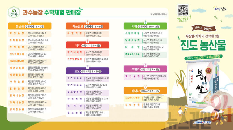 특히, 농림축산식품부에서 인증하는 지리적표시 4대 우수 농산물인 진도검정쌀, 진도대파, 진도구기자, 진도울금과 조도쑥, 월동배추, 유자, 단호박 등 총 15개 품목을 담았다.