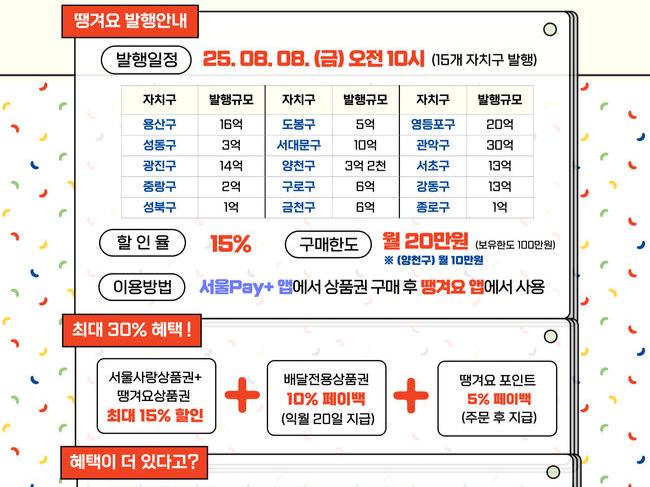 8월 8일(금) 오전 10시부터 15개 자치구에서 총 143억 원 규모의 `배달전용상품권`이 발행된다. 이 상품권은 `서울페이+` 앱에서 1인당 월 20만 원까지 구매할 수 있으며, 15% 할인된 가격으로 판매된다. 보유 한도는 100만 원으로 설정됐다. 다만, 양천구는 월 구매 한도가 10만 원이다. 상품권은 구매한 자치구 내 가맹점에서만 사용할 수 있다.