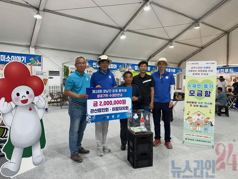 장흥군 관산읍의 사회단체인 관산읍민회와 관산이장자치회가 2일 물축제 특산물 판매장에서 수재의연금 200만원을 기부했다.