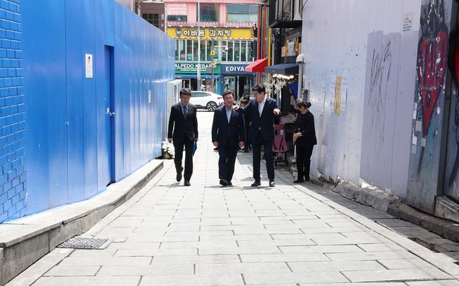 윤호중 행정안전부 장관이 4일 오후 서울 용산구 이태원 참사 현장 `10 · 29 기억과 안전의 길`을 살피고 있다.