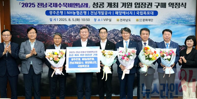 명창환 전라남도 행정부지사가 5일 도청 접견실에서 광주은행 30백만 원, NH농협은행 25백만 원, 전남개발공사 10백만 원, 해양에너지 10백만 원, 목포대 10백만 원 등 총 85백만 원 상당의 2025 전남국제수묵비엔날레 입장권 구매 약정식을 갖은 뒤 기념촬영을 하고 있다.