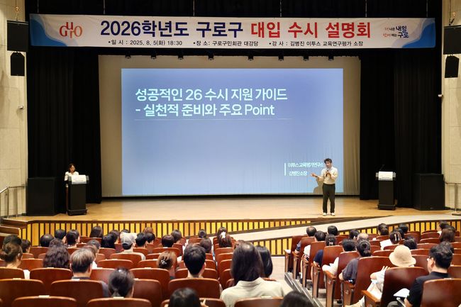 구로구가 8월 5일 구로구민회관 대강당에서 열린 ‘2026학년도 대입 수시 지원전략 설명회’에 300여 명의 수험생과 학부모가 참석하며 큰 관심을 모았다.