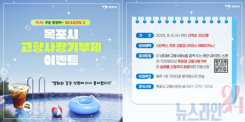 목포시는 고향사랑기부제에 대한 기부자들의 높은 관심과 적극적인 참여에 힘입어, ‘아·아 쿠폰왔썸머~ 고향사랑기부 참여 이벤트 시즌2’를 새롭게 추진한다고 밝혔다.