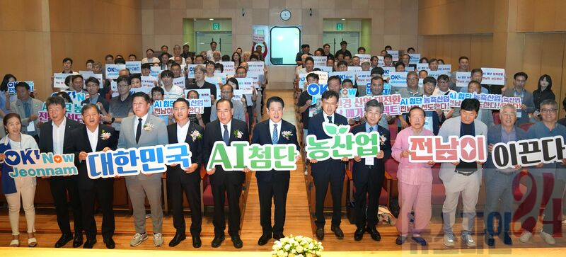 김영록 전라남도지사가 12일 강진아트홀에서 열린 ‘2025 전남 선도농업인 연합회 워크숍’에 참석, 선도농업인들과 퍼포먼스를 하고 있다.