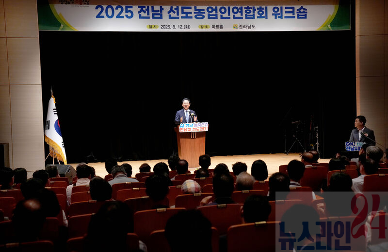 김영록 전라남도지사가 12일 강진아트홀에서 열린 ‘2025 전남 선도농업인 연합회 워크숍’에 참석, 축사를 하고 있다.