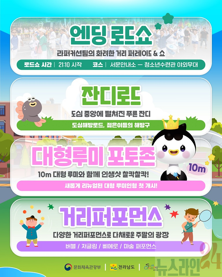 도심 속 젊음의 해방구, 8월 ‘주말의 광장’ 팔마문화제와 함께 돌아온다 6월 성황리에 마친 주말의 광장, 팔마문화제와 연계해 한층 업그레이드 잔디로드, 10M 대형 루미 인형 포토존, 물총 서바이벌까지 다양한 프로그램 준비
