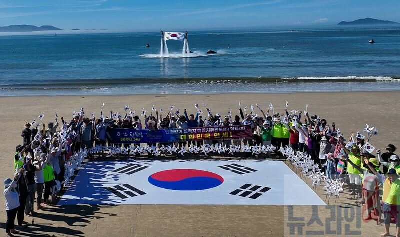 참가자들은 태극기와 바람개비 태극기를 들고 명사십리 해변 1.6km를 맨발로 걸으며 광복의 의미와 자유의 소중함을 되새기는 시간을 가졌다.