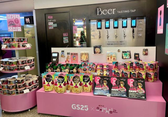 GS25 도어투성수에 `오징어 게임 시즌2` 협업 상품이 전시되어 있다