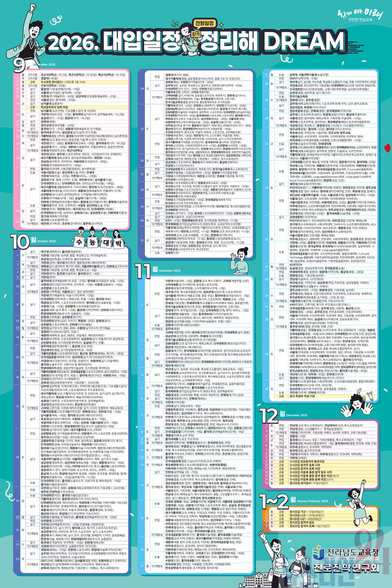 전라남도교육청(교육감 김대중)이 2026학년도 대학입시 수시모집 원서 접수를 앞두고 학생·학부모가 과학적이고 객관적인 자료를 바탕으로 지원 전략을 세울 수 있도록 ‘2026. 대입일정 정리해 DREAM’과 ‘2026학년도 수시로 대학 보내 DREAM’을 제작·보급했다.