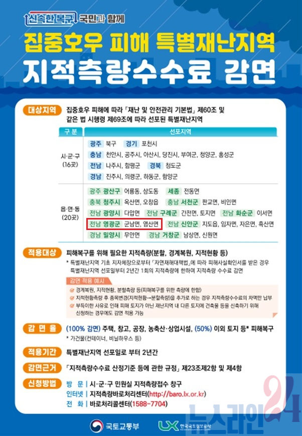 영광군(군수 장세일)은 지난 7월 16일∼20일까지 이어진 집중호우로 인해 군남면·염산면이 특별재난지역으로 추가 지정됨에 따라 수습 및 복구지원을 위한 지적측량 수수료 감면 조치가 시행된다.