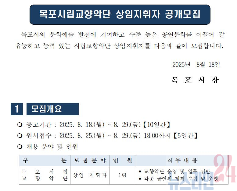 목포시 문화예술 발전에 기여하고 수준 높은 공연문화를 이끌어 갈 유능하고 능력 있는 시립교향악단 상임지휘자를 붙임과 같이 모집합니다.