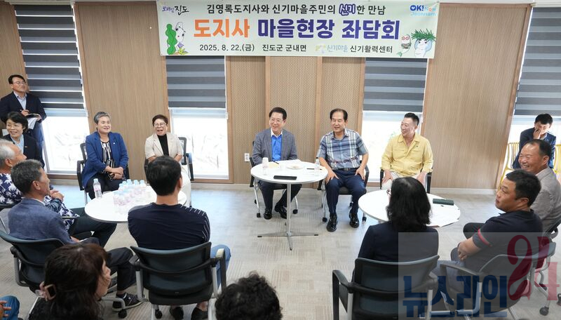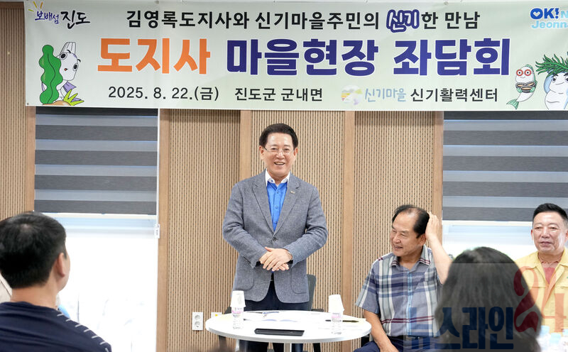 김영록 전라남도지사가 22일 오후 진도 신기마을에서 현장 좌담회를 열고 건의 및 애로사항을 청취하는 등 주민들과 직접 소통을 하고 있다.