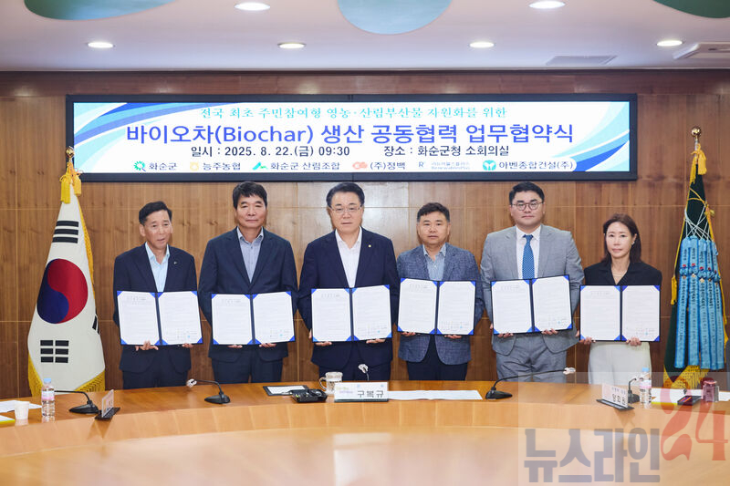 화순군(군수 구복규)은 22일 영농 및 임업 부산물의 효율적인 처리와 바이오차 생산을 통한 자원화로 농업 및 산림 환경 개선, 지속 가능한 발전을 목표로 화순군·관내 영농기관·기업과 공동 업무협약을 체결했다고 밝혔다.